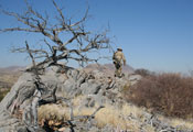 Dann begrüßt Titus John. Ein Jagdtag in der Nähe des kleinen Waterbergs beginnt. Das Jagdgebiet ist Titus bestens bekannt, da er hier seit 26 Jahren arbeitet. Die Berufsjagd ist seine Leidenschaft und sie wurde für ihn zu einem wichtigen Lebensinhalt.