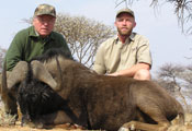 Titus konnte in der Nacht kaum schlafen. Zwar ist ein Wildebeest ein zähes Tier - dennoch, nach dem Schuss mit einer .375 H&H? Als Titus am nächsten Morgen zur Stelle zurückkam an der das letzte Blut gefunden wurde, war er zu allem entschlossen. Und dann, nach einer zweistündigen, weiteren Nachsuche, nahmen sie zu zweit wieder die Fährte auf. Der Bulle trennte sich von seiner Herde und deutlich wiesen seine Spuren den Jägern den Weg. Als Titus und John auf ihn hoch machten, lag er unter einem Baum im Schatten. In dem Moment, in welchem er aufspringen wollte, hallte Johns Schuss - 80 Meter weiter brach Johns Trophäenbulle zusammen. Und als John und Titus das Camp erreichten hatten sie allen Grund eine spannende Jagdgeschichte zu erzählen: John widerfuhr ein echtes afrikanisches Jagderlebnis, Titus erlebte wieder zwei aufregende Arbeitstage.