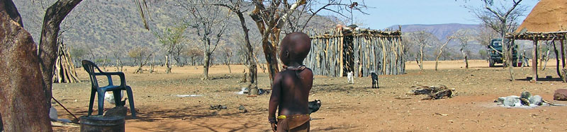 Über Stock und Stein, Sand und Kies, Geröll und Felsen geht die „Pad“ Richtung Kunene, dem ganzjährig wasserführenden Grenzfluss zwischen Angola und Namibia. Die Hitze brennt. Und plötzlich stehen sie da, die nach denen wir suchten - die ersten Ovahimba. Dieses halbnomadische Hirtenvolk gehört noch zu den ursprünglichsten Namibias. Als Rinder- und Ziegenhirten sind sie ständig unterwegs und ziehen ihren Herden und dem frischen Grün hinterher. Oft sind verlassene Lehmhütten am Wegesrand zu finden. Beladen mit Hab und Gut laufen ihre Esel vollbepackt, nur mit Stock und Machete bewaffnet durchstreift dieses Volk den Busch – allem ausgeliefert, was dort lauert. Leoparden sind nicht selten hier oben im Norden, auch hier und da werden vereinzelt Löwen gesehen, von Schlangen und Skorpionen ganz zu schweigen. Und dann ist da noch etwas, der plagende Durst. Wasser, das Lebenselixier ist kostbar und selten.